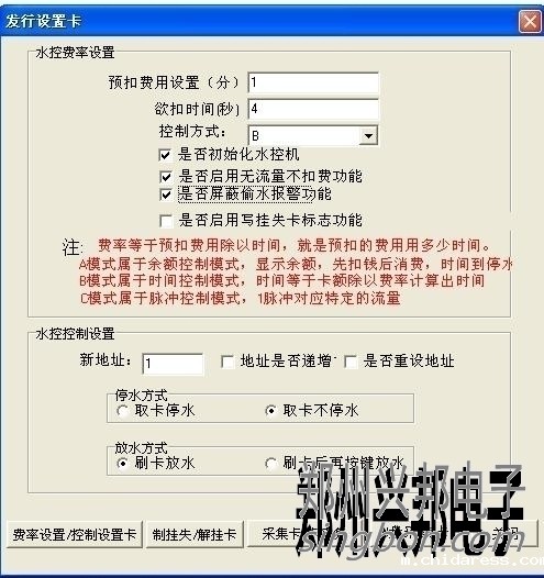 2、在水控费率设置里面,预扣费用设置写1,预扣时间写4,控制方式选择B,按下图来设。然后制一张费率设置卡。