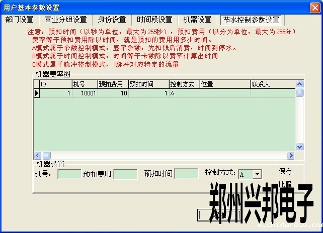 双击要修改水控费率的机器号,在机器设置中会出现机器的基本信息。输入预扣费用及预扣时间,选择控制方式后单击【保存】按钮即可。每更改一次费率都要下载一下水控机基本参数。