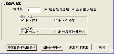 2 水控控制设置:新地址设置为1,把地址号是否递增和是否重设机器号前面的选项选上,如下图所示,点击费率设置|控制设置卡按钮,点击控制设置卡, 即可成功制作成控制设置卡去修改联网型水控一体机的机器号。控制设置卡在机器上数卡成功时会提示8 OK 9 OK 10 OK