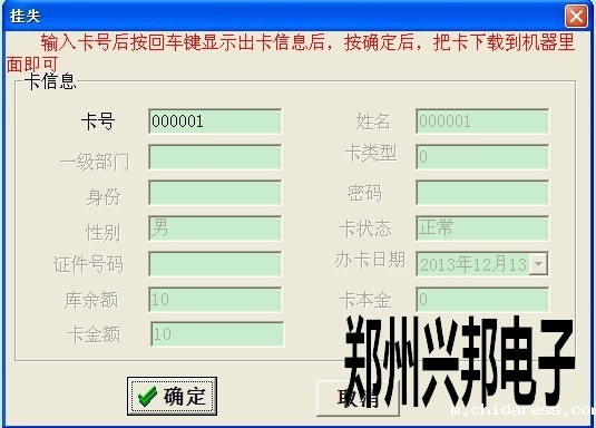 1. 打开485售饭机软件--卡挂失,输入卡号后按回车,当出现卡信息时点确定键即可挂失此卡。