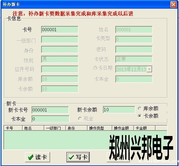 2. 此卡挂失后,然后点卡管理--补办新卡,打开此对话框后输入卡号后按回车键,当出现卡信息时,把新卡放到读卡器上点读卡,然后点写卡即可,如下图所示
