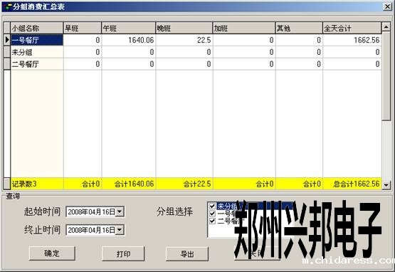 根据时间查询出每组机器在每个时间段和所有时间段的消费汇总情况,此表一般在给餐厅结帐时使用。
