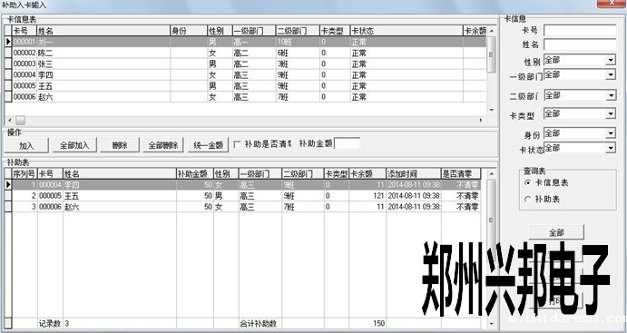 1.485软件打开后,点一下卡管理--补助入卡--补助入卡输入,打开补助入卡输入窗口,在右卡信息中输入想要添加的人员条件后,点击下面的查询,然后在左边的补助金额后面的框中填写补助金额,可以选择是否清零,若选择补助清零,在领取补助时会将卡上的金额先清零再补助上此次的金额;若选择不清零,则在领取补助时会累加之前卡上的金额。点击全部加入,就给选出来的人员生成补助.关闭此画面,如下图所示。
