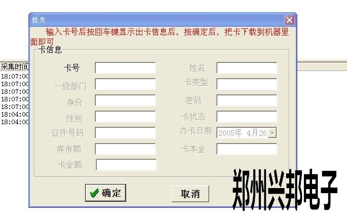 输入卡号,然后按回车键,卡里面所存入的信息都会显示出来,然后点确认,会出现一个挂失成功的提醒。这时,卡就挂失成功了。如果不知道卡号,可以在卡信息表时根据姓名,证件号等来查询卡号,然后再操作上面的这一步。