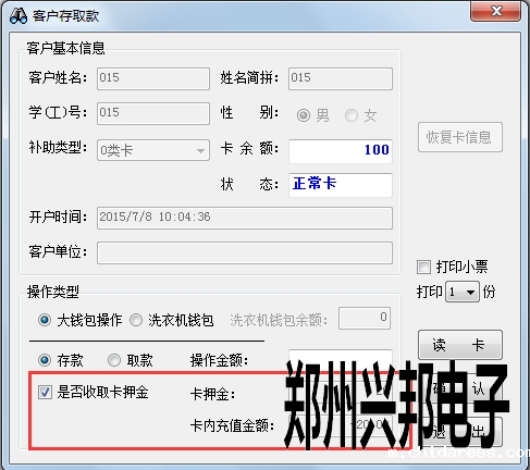 使用方法:首先要在制卡参数组中设置要收取的卡押金的金额,以元为单位,例如设置为20元。然后打卡存取款的界面,将需要充值的卡放到读卡器上,点击读卡,会显示出这张卡的信息,在操作金额一栏输入要操作的金额,然后勾选是否收取卡押金,勾选后会自动显示出卡内实际的充值金额,是操作金额减去押金后剩余的金额,然后点击确认即可。