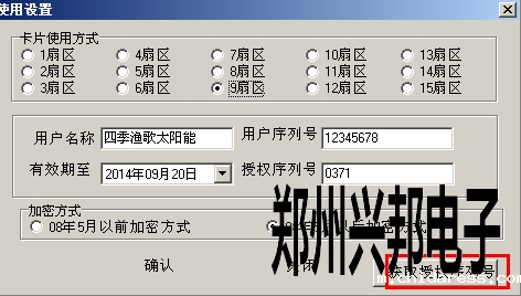2.双击后出现下图所示的界面,点击该界面右下角的【获取授权序列号】按钮,即可读出当前数据库中的设置,包括 使用扇区、用户名称、用户序列号、授权序列号、加密方式