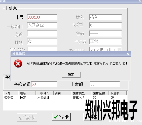 客户在使用我们的局域网一卡通存款时出现:写卡失败,请重新写卡,如果一直失败或关闭本功能,请重写卡片,卡金额为50!