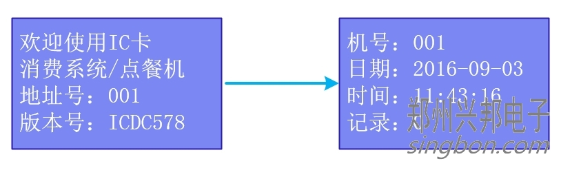 将消费机插上12V电源,开机时显示版本号和机器号,最后转入待机界面,显示机器号、日期、时间界面。