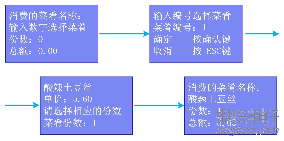 ① 自动模式:输入菜肴编号,点击确认后选择份数,点击确任后出现消费的菜肴名称、份数、总额,将卡片放于刷卡区,即可进行扣费,扣费后显示扣费金额、手续费用、卡上余额、卡号,操作流程如下图所示: