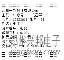 ② 计算模式:输入扣费金额,按[确认]键后,将卡片放于刷卡区,即可进行扣费,若连接的有打印机,可直接打印消费明细,打印出的信息如下图所示:
