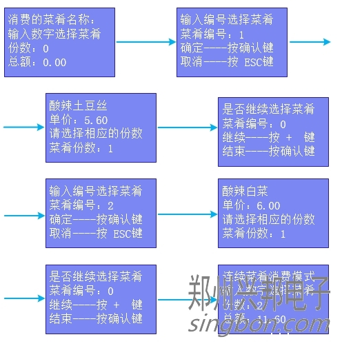 ③ 连续菜肴消费模式:输入菜肴编号,点击确认后选择份数,点击确认后出现“是否继续选择菜肴,菜肴编号:0,继续----按 + 键,结束----按确认键”,点击“+”号,输入下一份菜肴编号,点击确认后选择份数,点击确认后出现是“是否继续选择菜肴,菜肴编号:0,继续----按 + 键,结束----按确认键”,点击确认,出现消费的份数、总额,将卡片放于刷卡区,即可进行扣费,扣费后显示扣费金额、手续费用、卡上余额、卡号,操作流程如下图所示: