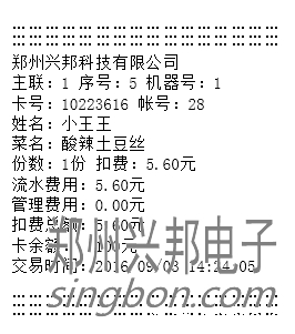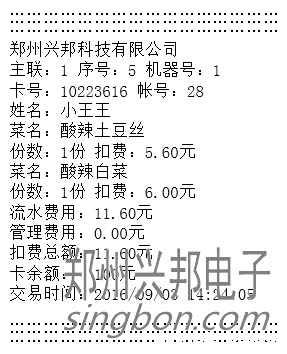 3) 自动消费模式:最多可设置8个费率,每个费率可设置对应的菜肴、份数,将费率设置好之后在自动模式下输入相应的费率编号放卡即可自动扣除相应费用。只有计算和自动模式可以用,计算模式只作为查看使用,不能扣费。若连接的有打印机,可打印消费明细,打印出来的消费明细格式如下图所示: